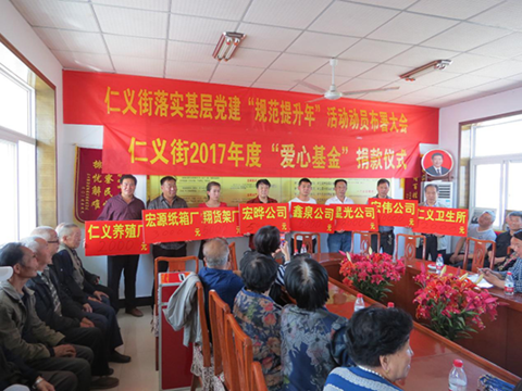 “一人富不是富,共同致富是幸福”,“要把党的温暖送到每一个家庭”,做为村街当家人,村“两委”把带领全村人奔小康,把共同富裕、共亨发展成果当作一个基层党支部的重任。村街牵头建立了企业负责人联谊会机制,在利用联谊会帮助企业之间加强沟通之际,引导他们与村街群众加强沟通,引导他们与村街贫穷家庭结帮扶对子。条件成熟后,仁义街成立了村“爱心救助基金”,为村内企业家、致富户对贫困户救助搭建一个平台。基金从启动到现在已募集善款40余万元,帮扶救助了400余户(次)困难家庭;为30余名大学生发放了助学奖学金。在村“两委”的带动下,捐款人员也从企业老板延伸到产业工人、农民,在村街内形成了社会主义核心价值的“大爱”之风。自农村合作医疗保险、农村养老保险推广以来,这两项支出以集体出资的方式予以重点保障,做到全覆盖,参保率达到100%,使村民做到了治得起病,养得起老。随着村街财富积累的增加,村街每年还为村民发放生活补贴:60岁以下的每人每年200元,60岁以上的每人每年700元,60岁以上的党员增发500元。